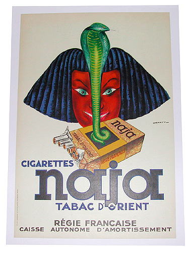 To stress that their cigarettes are made from oriental tobacco, the company commissioned Dransy (Julse Isnard [ca. 1883 - 1945], French) to produce this poster drawing on the recently opened tomb of King Tut. The delighted Pharaoh with his cobra smiles at a pack of Naja cigarettes. The poster measures 23 1/2" x 16".