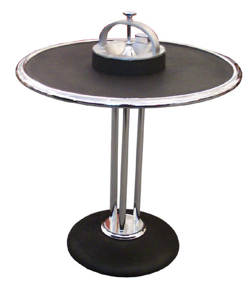 W.J. Campbell designed this art deco cocktail smoker in 1934 for the Climax Machinery Company of Indianapolis. The smoke stand and ashtray feature a circular ring which can be removed to serve drinks. The ashtray has a lifting device to deposit spent ashes into a tube which can be emptied, the tray has wide depressions which accommodate cigars and a raised portion for matches. Henry Dreyfuss used similar aluminum and chromed steel Climax ashstands on the lounges of the Twentieth Century Limited and other trains. The 26" high stand is an icon of the American Deco Era and is pictured in Duncans American Art Deco and the Brooklyn Museumâs Machine Age. The ring has the original Climax decal.