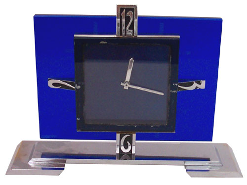 A truly spectacular American art deco spring wound table clock. The clock rests on a chrome base with two broad feet. The cobalt blue glass body rests on the number six which like three, nine and twelve are in chrome. The lesser numbers are represented by lines etched in the glass. The clock works have been professionally cleaned and keep good time. The clock measures 5” high by 7” wide.