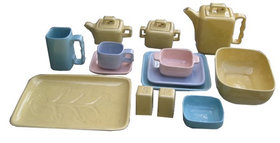 This rare, complete, and unique fifty-nine piece luncheon set was designed ca. 1951 by Lawton Gonder for his company Gonder Pottery South Zanesville, Ohio. It is from a short lived line known as “La Gonda”. Gonder Pottery opened in 1941 in Zanesville, Ohio and closed in 1958. The service for eight which is based on cubes with rounded corners is in soft 50’s pastel colors of blue, pink, yellow and gray. Marked “This Piece Individually Handcrafted by Gonder”, the set contains two items of each color as follows: 8 Luncheon Plates, 8 Salad Plates, 8 Mugs, 8 Cups, 8 Saucers, 8 Fruit Bowls, One Coffee Pot, One Sugar & Creamer Set, One Salt & Pepper Set, A Serving Platter, A Serving Vegetable Bowl and Four Jelly Dishes.