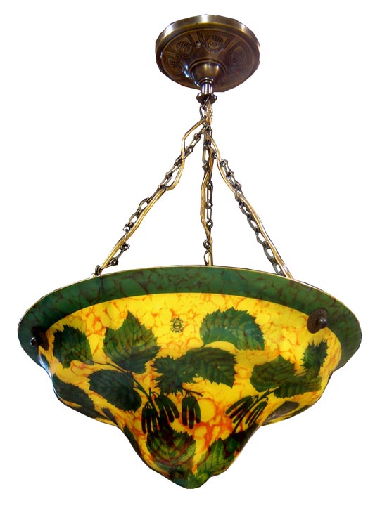 This Czechoslovakian art deco ceiling light is signed in the cameo “Venus Glas” and “Cewebo” and is from the 1930’s. The yellow with orange striations glass is overlaid with a green glass upper layer which is acid etched to reveal tumbling leaves and a green upper border. The brass fittings, chain and ceiling cap are original. The glass is 18” in diameter and drops 28” from the ceiling (this can shortened by removing links if desired). The lamp has been rewired form American electricity.