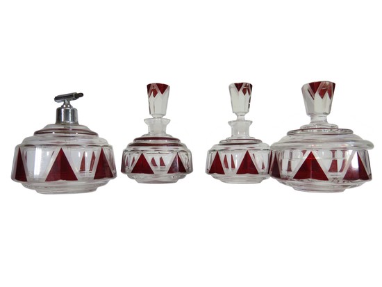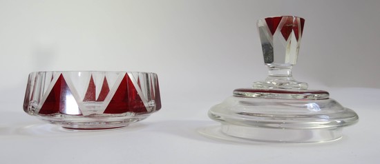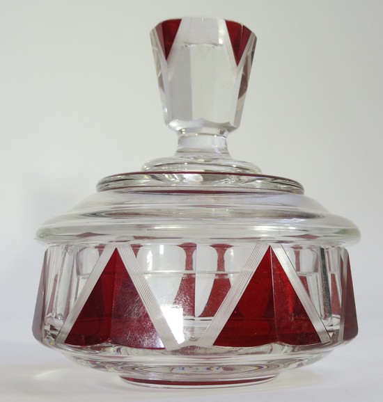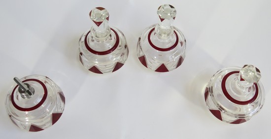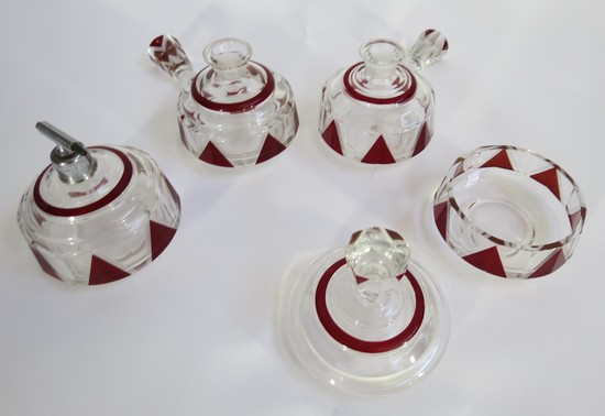 A striking czech leaded glass dresser set from the 1930’s. The set has a powder jar, two perfume or cologne bottles and a spray atomizer. The set is clear glass with red enamel, the enamel is highlight by a series of wheel cut lines, the body and finials are faceted. the tallest is 5 ¼” high.