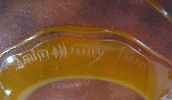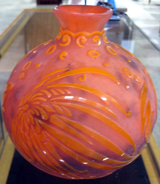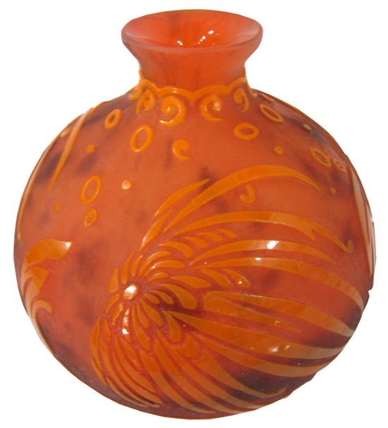 This striking French art deco cameo glass vase is by the Daum firm of Nancy. The upper layer of orange yellow glass is acid etched to reveal the orange lower layer and create a design of geometric chrysanthemums in bloom. In addition to the color contrast, the upper layer is highly polished while the lower layer has a mat textural finish. The vase is signed on the base “Daum Nancy, France” with the Cross of Lorraine and it measures 7 1/2” high.