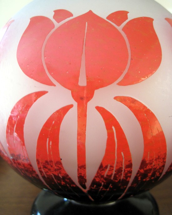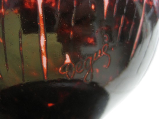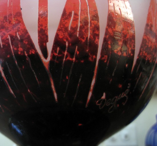 This French art deco cameo glass vase was designed by David Gueron for his own company "Verre d'Art Degue", known as "Degue". The company, founded in 1926, lasted only until 1939 when Gueron closed the factory and fled the Nazis. The mouth blown spherical vase sits on a cushion foot. The frosted white glass ground is overlaid with deep purple glass on the foot to a brillian reddish orange glass above. The upper layer is acid etched away to create a field of stylized tulips. The vase is signed "Degue" and "Made in France". The vase measures 9 1/4" high and 8" in diameter.