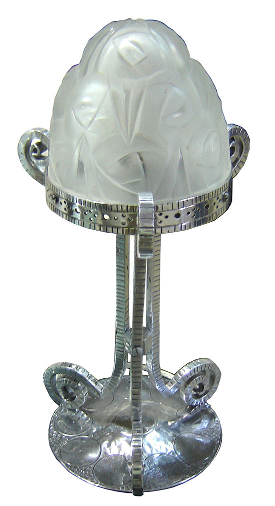 This French art deco table lamp is from the 1930’s. The body is crafted from polished aluminum. The geometric frosted glass shade is boldly signed “Degue”. The lamp measures 17” high and 9” in diameter.