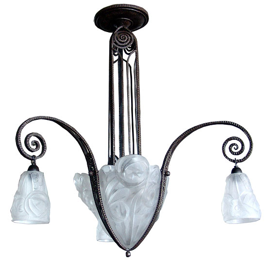 This French art deco chandelier features a combination of high quality wrought iron and the best of Degue glass. The wrought iron is finely detailed and supports a thick glass center bowl and three matching shades, all executed in a dynamic swirling geometric roses patern and all signed “Degue”. The fixture drops 36” from the ceiling and is 30” in diameter.