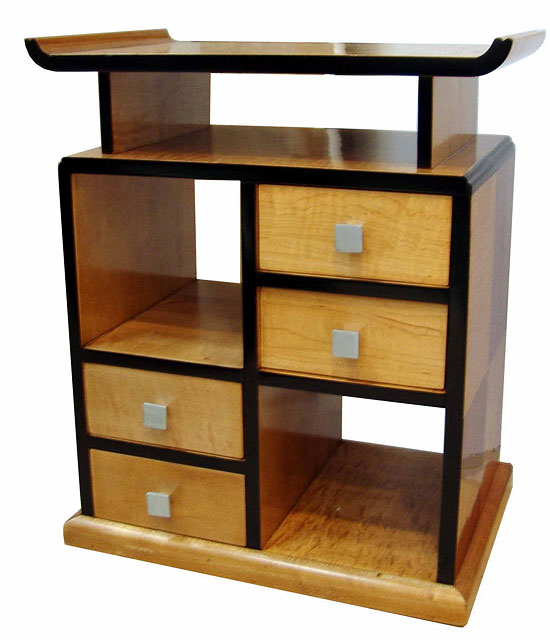 This American art deco table was manufactured in the late 1920’s by Dynamique Creations. Of quarter sawn maple veneer and mahogany, the table has four drawers which can open from either side and two shelves which extend through the piece. Dynamique Creations was a short lived subsidiary of Johnson Hadly Johnson dedicated to producing innovative high quality furniture. The table measures 21 ½” wide x 13” deep x 25” high.
