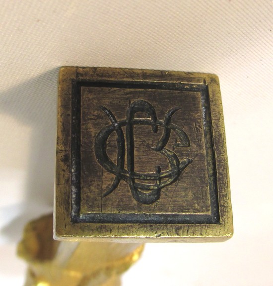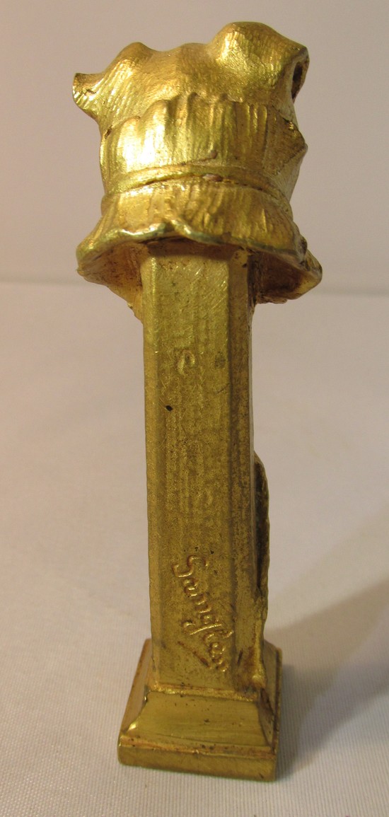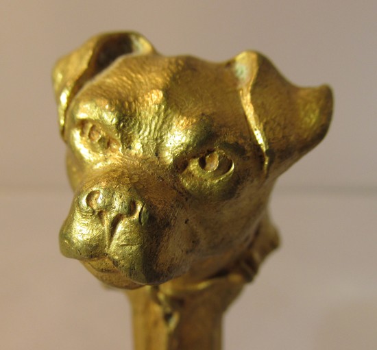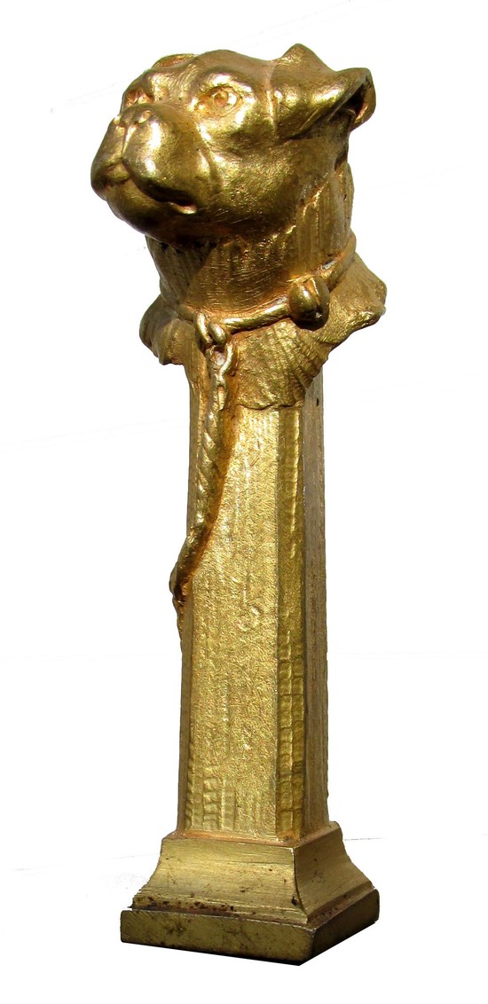 This bronze seal in the form of a dog’s head on a post is by the French sculptor Ernest Sanglan. The finely wrought bronze has a gold patina. The dog’s leash trails down the column. It is incised “Sanglan” and is 3 3/8” tall.