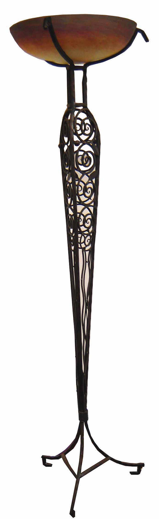 This art deco torchiere was made in the 1920’s by the French wrought iron master Edgar Brandt (1880 – 1960). The 17 ½” diameter shade is of internally decorated pate de verre glass by Muller FreresMuller Freres