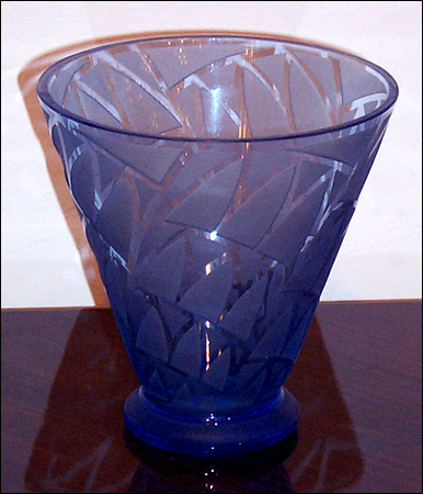 A blue deeply acid cut clear and frosted art deco glass vase by Editions Kaza. The vase is French and from the 1930's. Signed on the bottom, "Kaza, France", the vase stands 5" high and is 5" in diameter at the top.