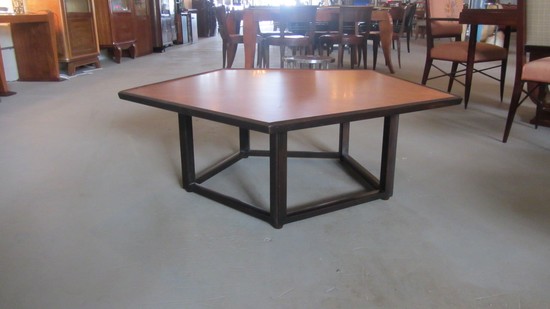This American art deco coffee table was designed by Edward Wormley (1907 - 1995) for the Dunbar Furniture Company, Berne, Indiana ca. 1955. The pentagon shaped table has mahogany dark stained legs and and inset burlwood top. The table is 48" in diameter and is 17" high.