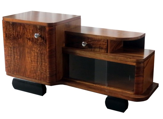 This 1930’s English Art Deco cabinet sits on two black lacquer feet and features a storage chest with shelf, a drawer and a storage shelf with sliding glass doors. The door and drawer fronts are veneered in highly figured walnut. The cabinet is 43” wide, 21 ½” high and is 15” deep.