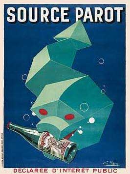 G. Favre created this French art deco poster for the bottled water company Source Parot in the late 1920s. Taking the firm's symbol of an ancient sea monster he transformed it into a green geometric one on a blue background holding the company's bottle in its mouth. The poster measures 63" x 47". The poster was produced by Creation Affiches Gaillard in Paris & Amiens.