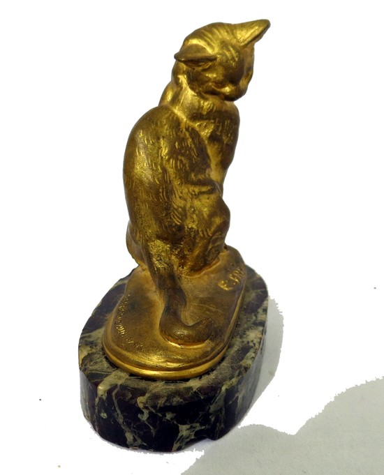 This gilt bronze figure of a seated cat is by famous French sculptor Emmannuel Fremiet (1824 – 1910). It is incised on the base “E. Fremiet” and”P. Barbadienne”, Paris”. The sculpture sits on an oval ½” high piece of marble (much abused) and is 3 1/8” high.