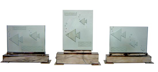 Seven very deco fish populate this 1930’s French art deco luminaire. Three glass slabs etched with fish and bubbles sit on footed nickel bronze bases. The center glass is illuminated from below and has been rewired for American electricity. The illuminated piece measures 9-1/2” high by 8” wide and 2” deep. The other two each measure 6-3/4” high by 9” wide and are 2” deep.