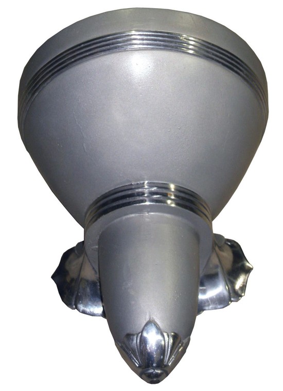 This set of four American art deco exterior wall sconces were removed from a 1930’s South Beach building prior to demolition. The sconces are of heavy cast aluminum in a matte finish with highlights polished to a bright shine. All feature a frosted glass cover set inside the bowl. The sconces measure 13” high x 10 ¼” wide and project 10 ½” from the wall.
