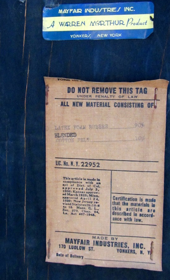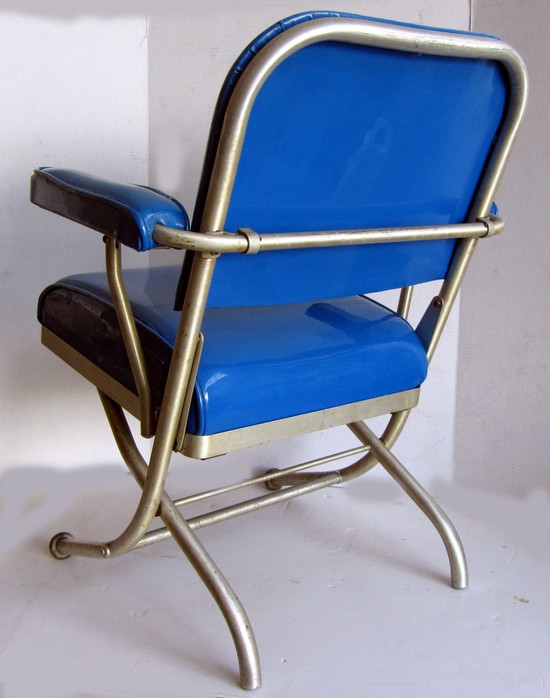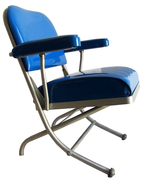 This set of classic American art deco folding chairs was designed by Warren McArthur (1885 – 1961) and made by his company, Mayfair Industries, Inc., in New York. He relocated from California to New York in 1933. With their sweeping aluminum structure and original bright blue vinyl upholstery, the chairs will add a note of sophisticated color to any room. The chairs are 33” high by 24” wide and 24” deep. They are in very good original condition.