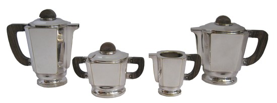 This 1930’s tea and coffee set was designed by Paris gold an silversmith Francois Frionne. The set, which consists of a coffee pot, tea pot, sugar and creamer is in silver plated metal with rosewood handles and knobs. It is stamped with his name and cipher on all pieces. The tallest pot is 7 ½” high.