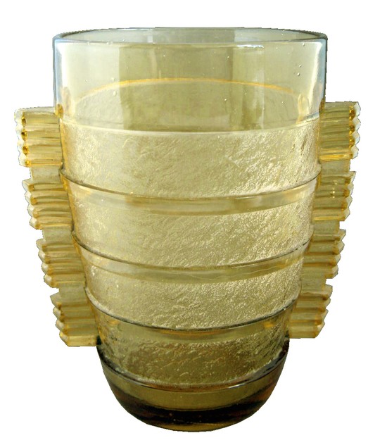 This very geometric French art deco vase is of translucent yellow glass. The vase has four ribbed wings on each side and four acid etched bands circling the body, separated by speed lines. Standing 8 ¼” high and 6” in diameter, the vase is 7 ½” across at the wings.