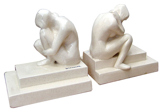 This pair of French ceramic art deco bookends dates from the 1920’s. Glazed in white craqueleure the bookends each depict a nude young woman with bobbed hair sitting on a two step base. They are both marked “Dimanche”. Each measures 5 ½” x 3 5/8” and are 5 ½” high.
