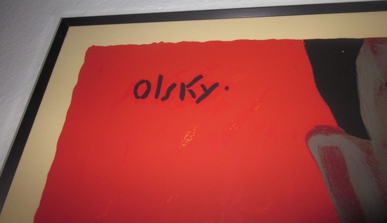 This striking vintage French art deco original stone lithograph poster shows a stylish and mysterious Frenchman with his moustache just above a white hat. The poster is signed in the plate on the upper left "Olsky" and printed on the lower right border "Vercasson" and "Creation Frevrier 1928". The poster is 43" high and 31 ½" wide. It is presented in a ebonized wood frame 45" by 33 ½". The poster is in excellent condition.