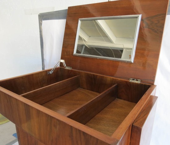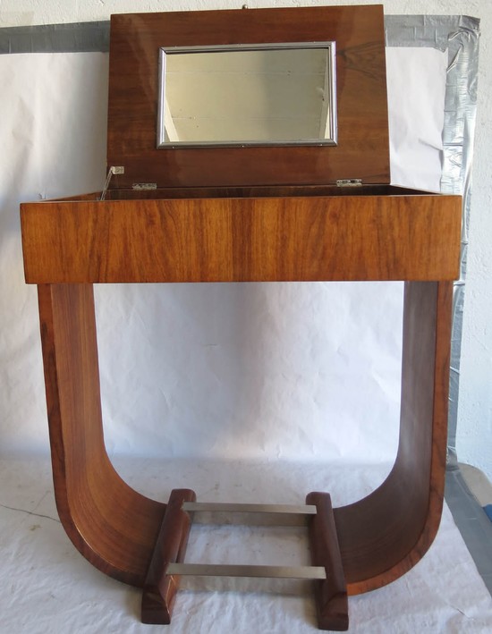 This French art deco console is from 1930’s. Constructed of Brazilian rosewood and Brazilian rosewood veneers. The lop lifts to reveal a mirror and three storage spaces. The two sides curve inward at the base where rosewood feet are connected by two polished chrome bars. The console is 16 ½ “deep 26 ½ “ wide and 29” high.