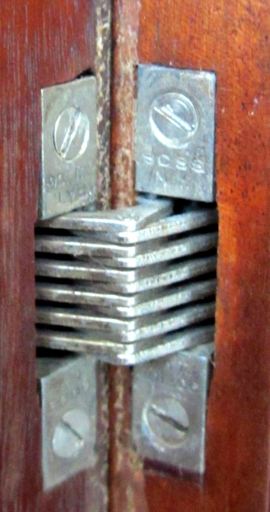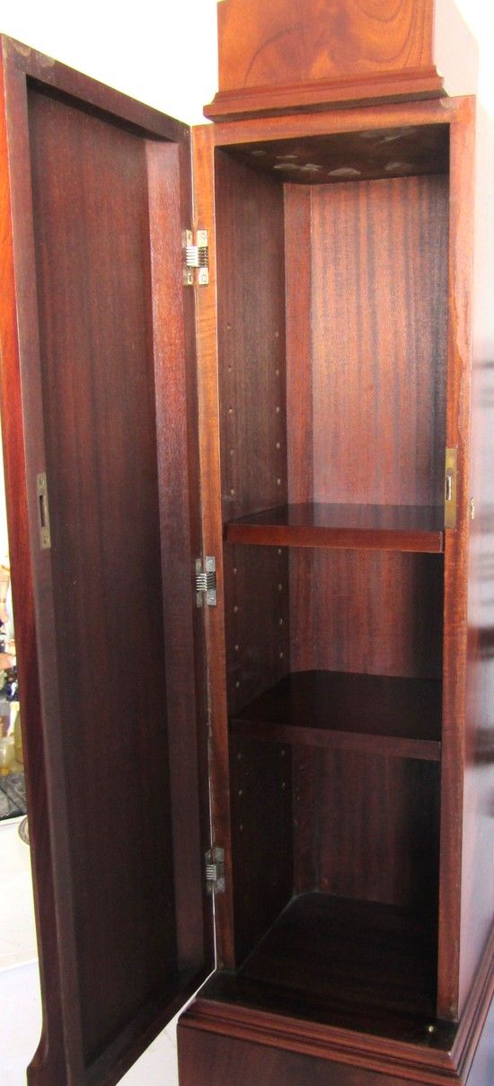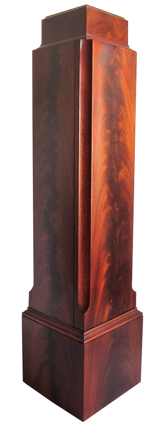 This French art deco pedestal is from the 1930’s. Constructed of solid flame mahogany, the pedestal has a tall door, which opens to reveal shelves showing most unusual hinges. It has an 11 ½” square base which steps up to the main column with scalloped edges and terminates in a very unusual accordion style. The pedestal is in excellent original condition, having just been cleaned and polished.