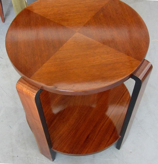 This French art deco occasional table is from the 1930’s. Constructed of mahogany and mahogany veneers, the table features a quartered mahogany parquetry 22” diameter top, four legs which curve at the top enclose a lower shelf. Black lacquer trim on the edges adds interest. The table is 24 ½ in diameter and 27” high.