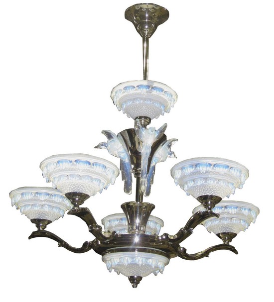 An amazing and spectacular 1930’s French Art Deco chandelier! With its nickel shaft, cones, wings and rings supporting seven illuminated opalescent glass bowls dripping icicles and three illuminated opalescent glass birds in flight, this fixture will be the centerpiece of any room. The chandelier drops 36” from the ceiling (can be shortened) and is 30” in diameter. The nickel has been replated and the fixture is rewired for American electricity.