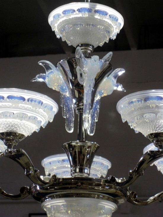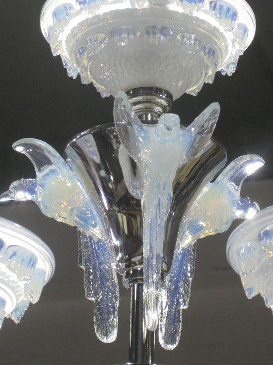 French Art Deco Opalescent Glass Chandelier BIRDS IN WINTER