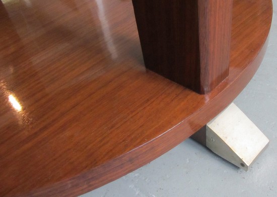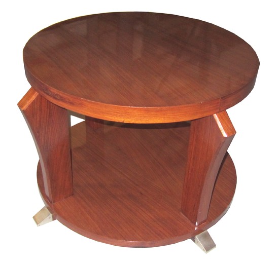 This French art deco coffee table is from the 1930’s. The top and bottom shelf are covered in fine Palissandre (rosewood) veneers. The legs and arched supports are solid rosewood. The feet are covered in nickel bronze sabots. The table is 33 ½” high and 35 ½” in diameter. The top surface is 31” in diameter.
