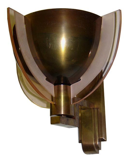 This 1930’s French art deco sconce was designed by Jean Perzel (1892 – 1986). A bronze bowl is extended from a three step bronze wall mount. Three “fins” in peach glass with frosted centers extend from the bowl. Rewired for American electricity the sconce measures 9” high x 10 ½” wide and projects 10” from the wall.