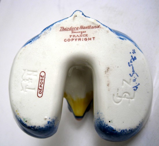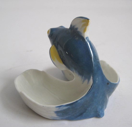 This French art deco porcelain double salt cellar was designed in 1917 by Edouard-Marcel Sandoz (1881 - 1971) for the Haviland Limoges Company. The “Flying Fish” with blue body and yellow eyes and fins stands guard over your salt. Known as “Saliere Poisson”, it is number 28 in the company literature. It is pictured on pages 80 and 132 in “Les Creations en Porcelaine D’ Edouard-Marcel Sandoz” by Jean Segonds. The cellar is 3” high and 3 ½” wide and is in excellent condition.