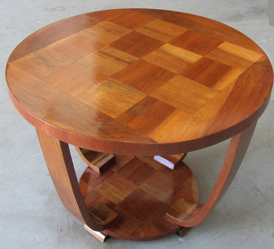 This French art deco coffee table is from the 1930’s. Constructed from rosewood and rosewood veneers, the table has a parquetry top and bottom shelf. Four gently curved legs connect the 27” diameter top to the 15” diameter bottom shelf. The table rests on four rounded feet and is 20” high. It is in excellent condition.