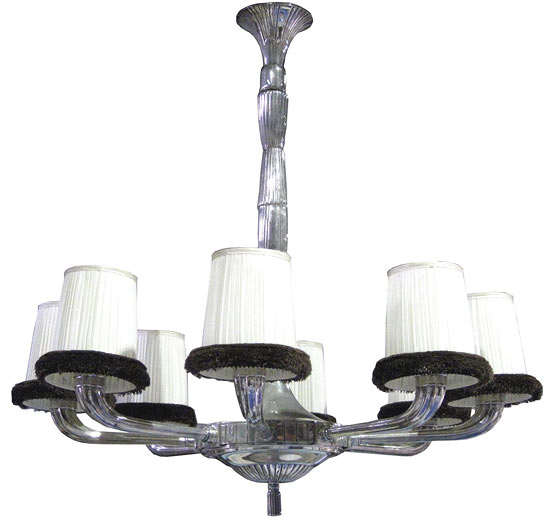 This impressive French art deco silver bronze chandelier dates from the 1920’s and is reminiscent of a chandelier from that period by Emile Jacques Ruhlmann. The seven piece silver on bronze column extends from the ceiling cap to the center bowl and ends with a tassel finial. Six gadrooned arms flow from the center bowl and gracefully turn up to support the six lights which are shielded by pleated ivory silk shades with brown redone fringe bottoms. The chandelier drops 38” from the ceiling and is 38” in diameter. Re-silver plated and rewired for American electricity and ready to install.