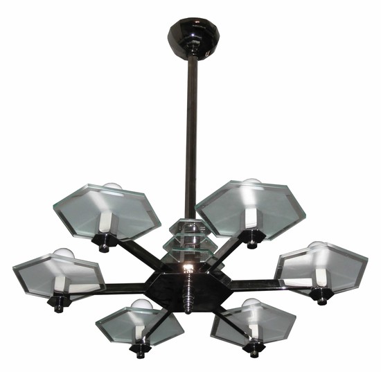 This 1930’s French art deco modernist chandelier has it in “sixes”. The bright nickel body hangs from a six sided shaft with six arms emanating from a six sided center, at the outer end of the arms are six sided sockets for the bulbs. The bulbs are above frosted and clear planes each with six sides. Above the center a pyramid of three discs is separated by spacers. The discs and spacers all have six sides. The chandelier, which is 23” in diameter and drops 31 ½” from the ceiling, has been replated in bright nickel and rewired for American electricity