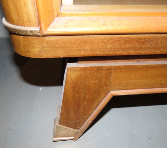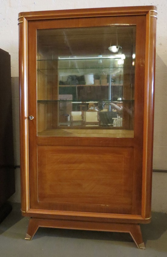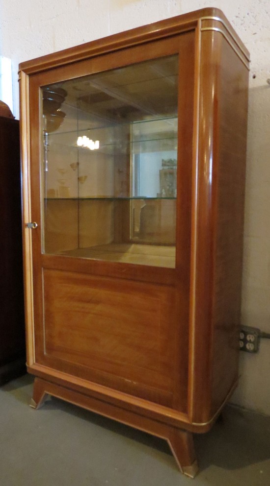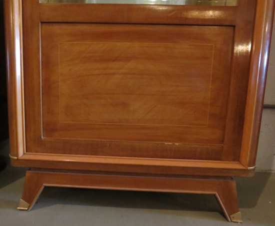 This French art deco vitrine is from the 1930’s and is remarkable for the high quality of its finish and attention to detail. The body is of select striped mahogany veneers with beech trim and bronze fittings. It even has its original key. The top portion has three shelves for display, the bottom is reserved for storage. The front feet have bronze sabots. The vitrine is 60 ¾” high, 35 ½” wide and 18” deep. It is in excellent condition.