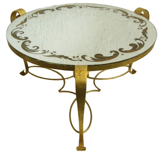 This French art deco cocktail table was designed by René Drouet (1899 – 1993) ca. 1939. The wrought iron base is gilded in gold leaf. The mirror top is etched from the bottom in arabesque designs filled with gold leaf. The table is 14” high and 30” in diameter.