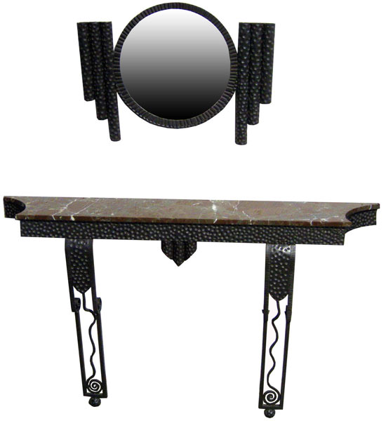 This exotic French art deco console and mirror date from the 1930’s. Both the console and mirror are of hand wrought iron with the major surfaces decorated with punched dots. The inverted skyscraper tubular sides of the mirror are echoed in the shield below the console’s apron. The console has a conforming top of Isidro Rosso marble and measures 65” wide x 12” deep and 36” high. The mirror measures 31” wide and 24” high.
