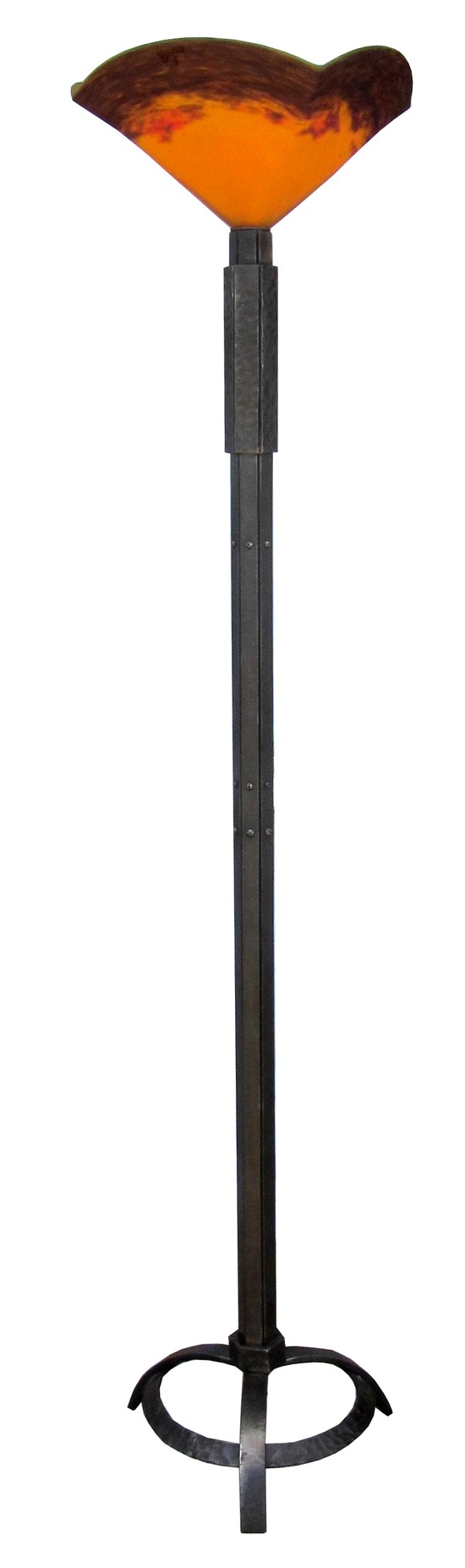 This striking French art deco torchiere is from the 1930’s. Constructed of hand wrought iron, the lamp is in true “machine age” style and equal in quality to the “master ferronieres” of the period with exposed rivets, a collar on the upper shaft all set on a curving tripod foot. The three lobed “pate d’verre” shade ranges from purple to orange to yellow and is signed “Degue” on the glass. When lighted, the glass emits a bright sunrise/sunset hue. It is 16” wide at the top and is 72” high. In excellent condition, the torchiere has been rewired to American electricity.