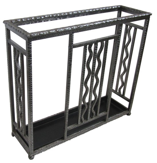 This French art deco hand wrought iron umbrella stand is from the 1930’s. The stand has a removable bottom pan to dispose of water from wet umbrellas. The stand is 23 1/2” high, 24” wide and 7 ½” deep.