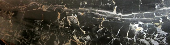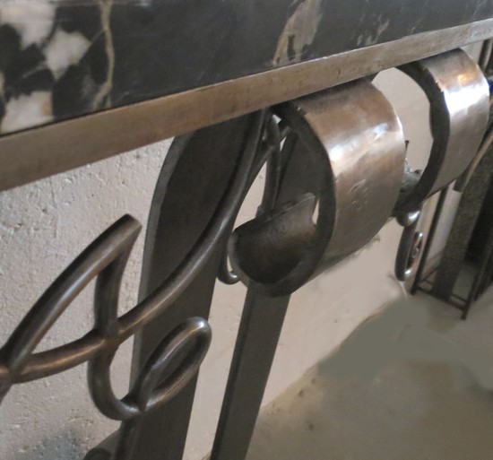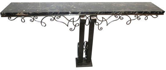 A magnificent late 1930’s French art deco console in hand wrought steel and rare Portoro black and gold marble. The marble sits in a steel tray supported by twin bars of flat band steel which loop down in the front and make a circle in the rear, then sit on a steel floor plate. A sinuous Arabesque decorates the lower edge of the marble tray and is echoed between the supports. The console is 68 ¾” wide x 34 ¾” high and is 13 ½” deep.