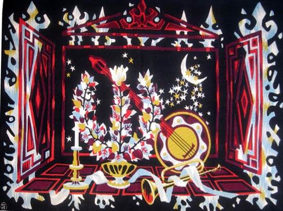 This sparkling French Aubusson wool tapestry titled “Clair de Lune” was designed by Michele Van Hout LeBeau for Robert Four in an edition of 100 of which this is number 25. The tapestry, which measures 39” x 62 ½” , is signed on the reverse and has the artist’s cipher woven into the lower left. There are brass rings on the back for hanging on your wall. Perfect for a music room / entertainment center!