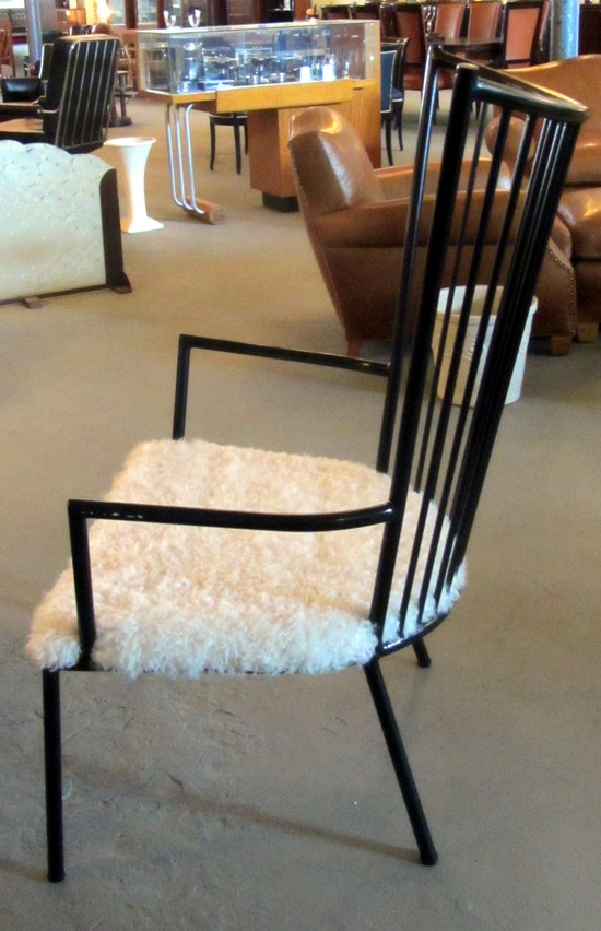 This large and comfortable French Mid-Century Modern Design arm chair offers a wonderful contrast between the black enameled metal body and the fluffy lamb’s wool seat. The oversized chair is 31” wide x 29” deep and 43” high and is in excellent condition.