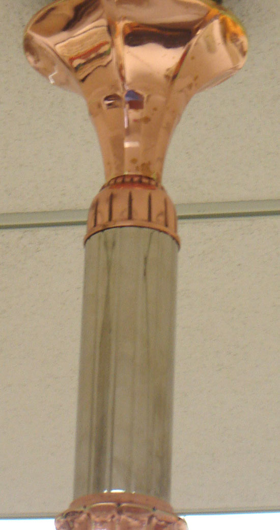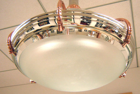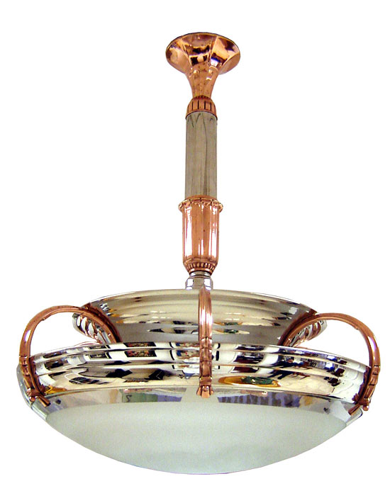 This handsome French art deco ceiling light is from the 1930’s. The ceiling cap and initial shaft are of polished copper. The central ribbed shaft is nickel with a nickel cone and bowl. The lower bowl is of ribbed nickel supported by six arches of copper. A clear and frosted glass dish is at the bottom. The upper bowl contains 3 sockets to wash the ceiling while the glass dish has a socket for lighting below. The lamp is 21” in diameter and drops 28” from the ceiling.