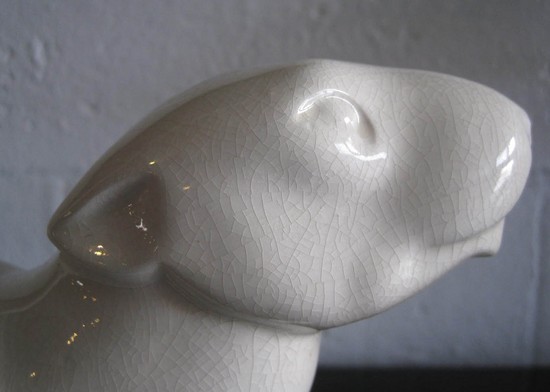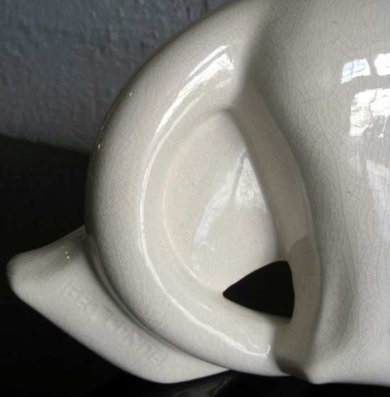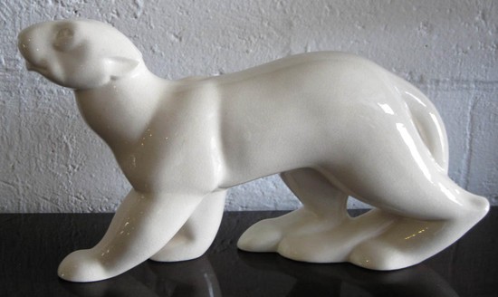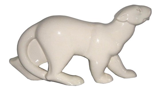 Géorges Conde (1891 – 1980) designed this sleek French art deco white craquelé ceramic panther in 1931. The panther was manufactured by Saint-Clement and retailed at “La Galerie d’Art Moderne Pomone” in Bon Marché, Paris. The panther is singed “Geo Conde” a name he adopted to avoid confusion with another artist of the same name. Standing 10 ½” high and 19” long, the panther is in excellent condition.