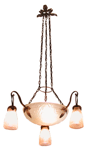 The height of this French art deco chandelier can be adjusted by removing links in the supporting chain. The glass in the center bowl and three shades is very geometric with stylized roses and leaves in high relief. The chandelier drops 44" and is 26" in diameter.