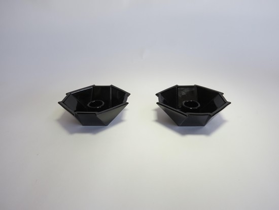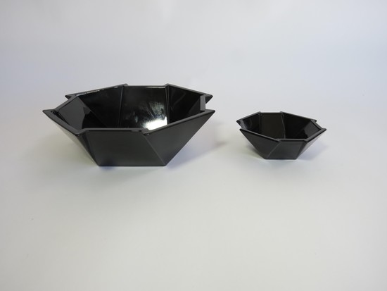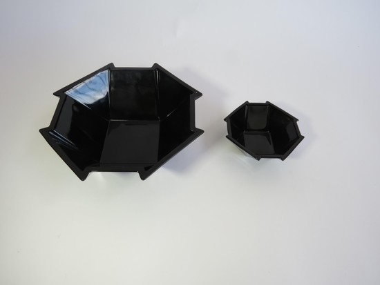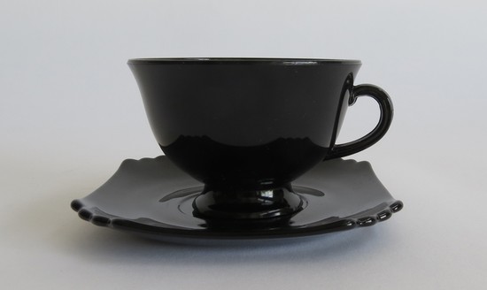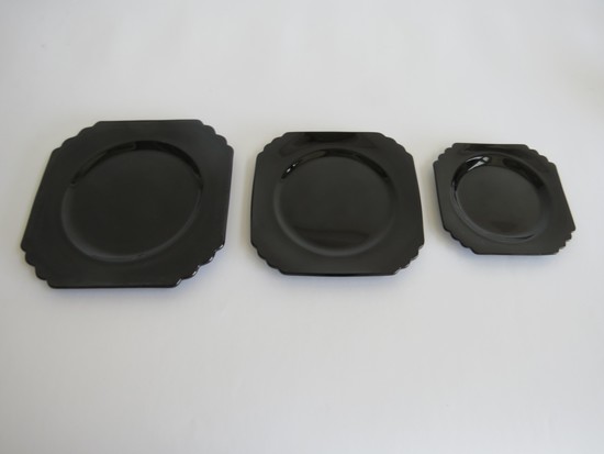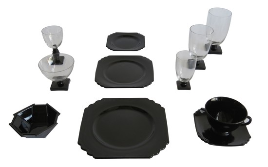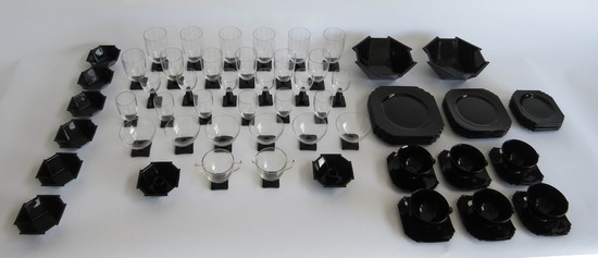 George Sakier (1897-1988) designed this very art deco 72 piece service for the Fostoria Glass Company, Moundsville, West Virginia in 1929 and 1930. The drinking vessels are from his 4020 line and feature a square ebony foot with stacked ebony stem and crystal bowl, the sugar and creamer are from the same line. The three sizes of plates are in ebony glass and are from his Mayfair line, as are the ebony glass cups and saucers. The two large serving bowls, the six ramekins and the two candle holders are all in ebony glass from his 2402 line.