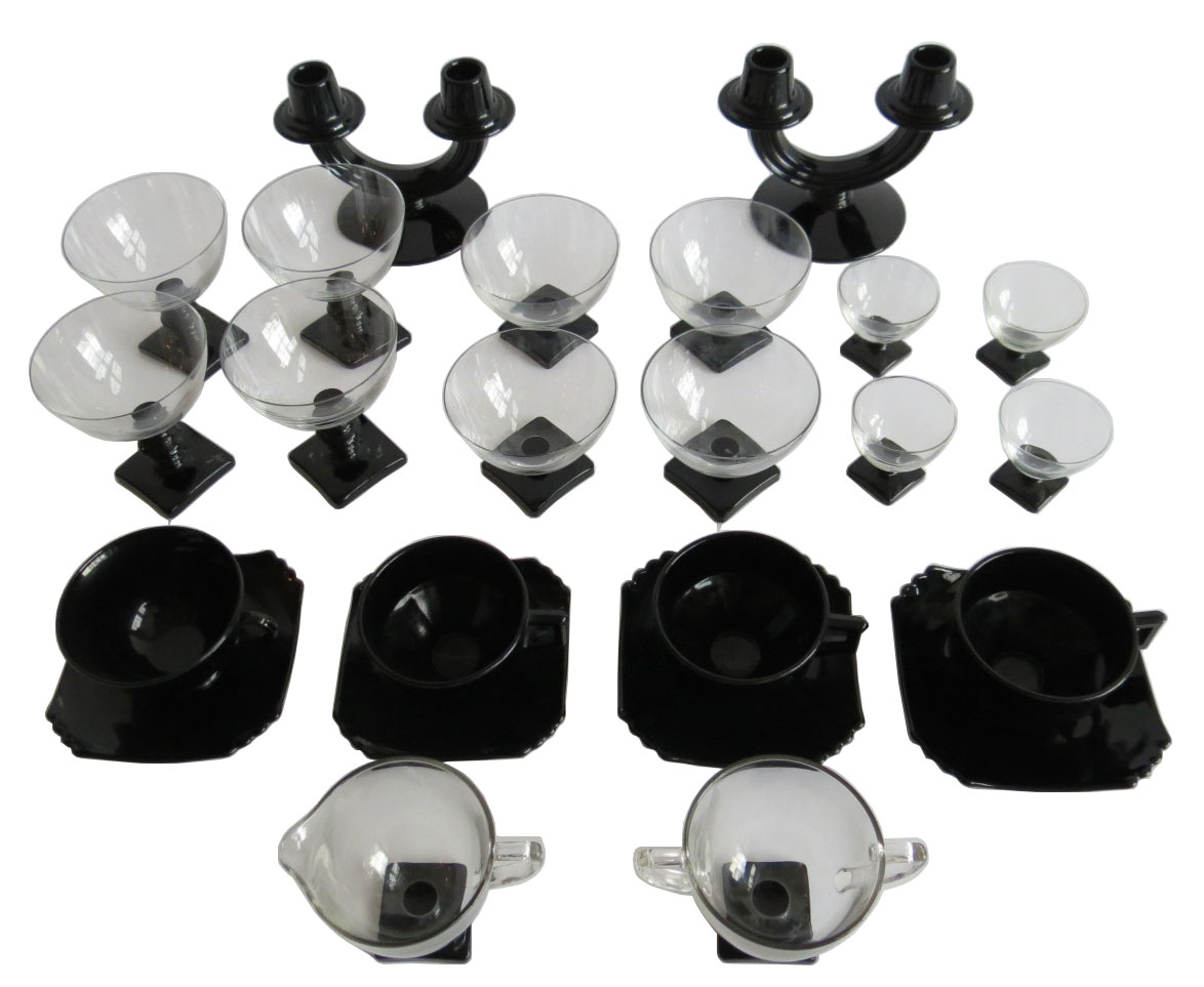 George Sakier (1897-1988) designed this twenty four piece service for four in 1929 and 1930. It was produced by the Fostoria Glass Company of Moundsville, West Virginia. The set consists of: 4 2419 Mayfair Cups 4 2419 Mayfair Saucers 4 4020 Champagne Glasses 4 4020 Low Sherberts 4 4020 Cordials 2 2447 Duo Candlesticks 1 4020 Sugar and Creamer