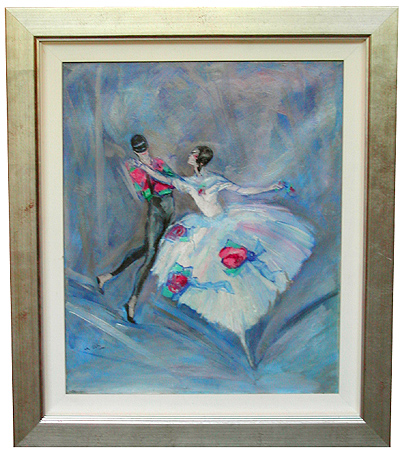 Swept up in the spotlights the couple in this oil on canvas painting by Charles Felix Gir (French 1883 – 1941), dances with abandon, he is still wearing his mask and she is holding hers in her right hand. Gir was famous for his paintings and posters for the theatre. He was also known for his elegant illustrations for literary collections such as Rostand's "Le Chantecler". The canvas is signed "Ch Gir" and measures 22" x 18". It is presented in a silver leaf frame measuring 28" x 25".